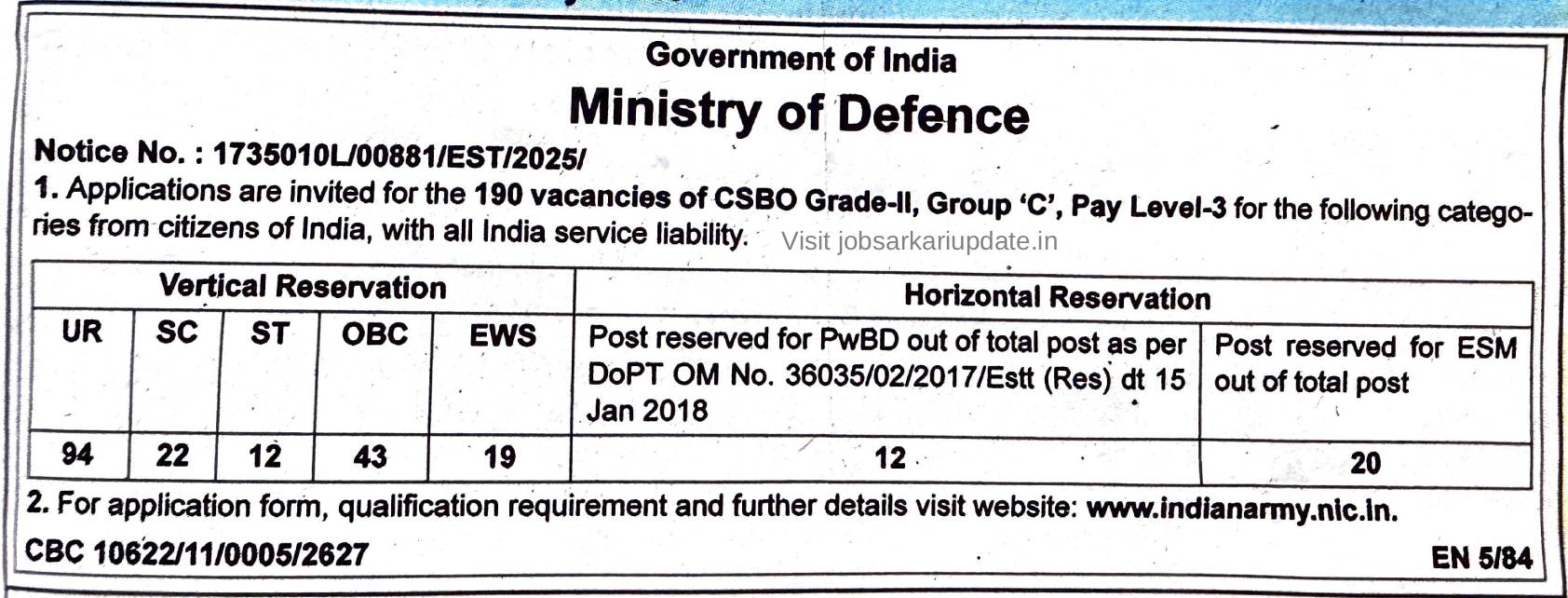 If you have been tracking Indian Army recruitment for civilian roles, the Ministry of Defence has officially released Notice No. 1735010L/00881/EST/2025/ for the position of CSBO Grade-II. A total of 190 vacancies are now open under Group ‘C’, Pay Level-3, carrying an All India service liability. Candidates across all categories can apply, subject to vertical and horizontal reservation rules. What sets this notification apart is the clear upfront reservation matrix — including PwBD and ESM quotas embedded within the total posts — which many official notices release separately later.