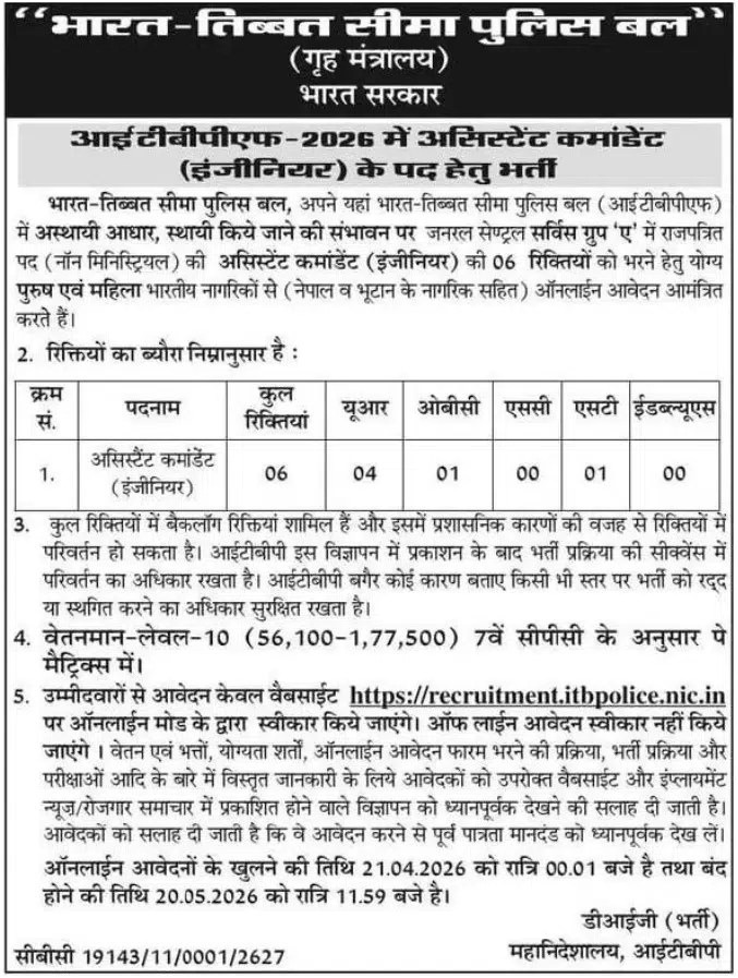 The in-hand salary for ITBP Assistant Commandant Engineer 2026 is a key question every civil engineering graduate is asking this season, and this article answers it in full along with every other detail from the official notification. The Indo-Tibetan Border Police Force (ITBPF), operating under the Ministry of Home Affairs, Government of India, has released its recruitment notification for the post of Assistant Commandant (Engineer) — a Group ‘A’ Gazetted, Non-Ministerial post in General Central Service. A total of 6 vacancies have been advertised on a temporary basis, likely to be made permanent. The minimum qualification is a Bachelor’s Degree in Civil Engineering. The notification was released in April 2026, with the online application window opening on 21 April 2026. Given that this is a gazetted officer-level post in a central paramilitary force with all-India liability and only 6 seats, competition from engineering graduates across the country is expected to be intense.
